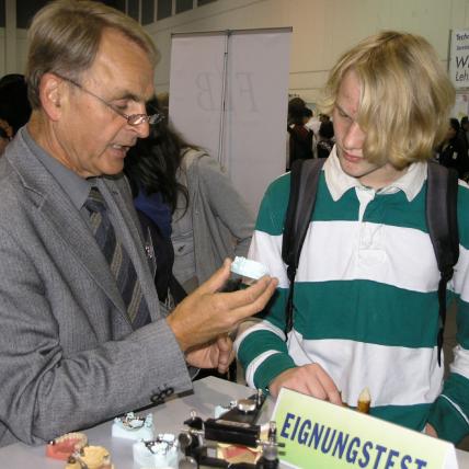 Wie im Vorjahr hatten auch diesmal die Standbetreuer an beiden Tagen alle Hände voll zu tun: Die Lebendwerkstatt betreuen, Kronen aufwachsen, Klammern biegen, die Tätigkeit eines Zahntechnikers erklären, Vorurteile abbauen... Unser besonderer Dank gilt diesbezüglich den Auszubildenden Franziska Köth (Dentallabor Manja Gögge) und Jacqueline Tolg (Dentaltechnik Thomas Lüttke GmbH), die mit viel Engagement und Können Schüler beim Eignungstest anleiteten und mit Enthusiasmus für den von ihnen selbst gewählten Ausbildungsberuf warben. Fachmännisch unterstützt wurden sie dabei durch Landesinnungsmeister K. Hesse und Landeslehrlingswart E. Behrend.