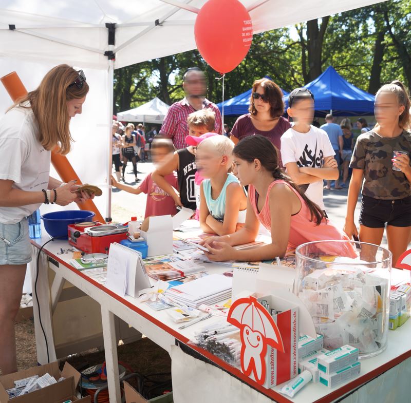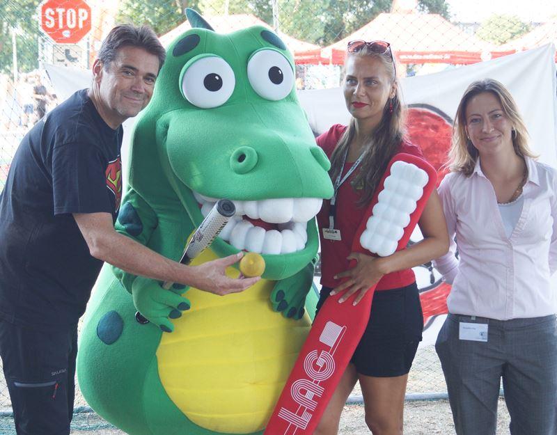 Parallel konnten sich die kleineren Besucher unseres Standes beweisen und unser Plakat mit einem aufgemalten Gebiss vor dem Baseball beschützen, je nach Trefferquote, gab es von der Zahnärztekammer tolle Preise zu gewinnen. In Zusammenarbeit mit der LAG (Landesarbeitsgemeinschaft Berlin zur Verhütung von Zahnerkrankungen) befand sich auch Kroko auf dem Fest und zeigte den Kindern am Kariestunnel, wie man sich richtig dieZähne putzt.