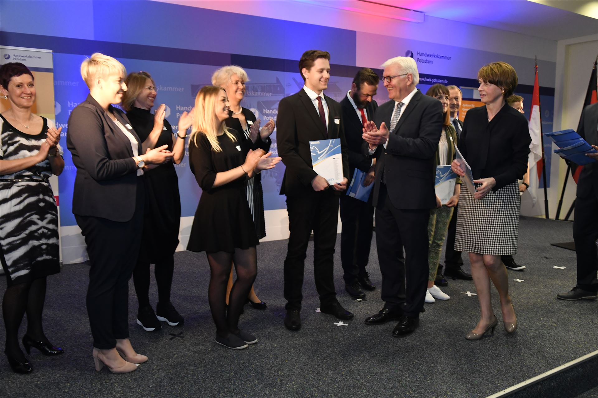24 junge Leute haben am 18. April 2018 von Bundespräsident Frank-Walter Steinmeier und seiner Frau Elke Büdenbender sowie dem Präsidenten der Handwerkskammer Potsdam, Robert Wüst, im Zentrum für Gewerbeförderung in Götz ihre Europässe erhalten. Die ausgezeichneten Auszubildenden lebten und arbeiteten im vergangenen Jahr drei bis vier Wochen in Italien, Spanien, Schottland, England oder Frankreich.
