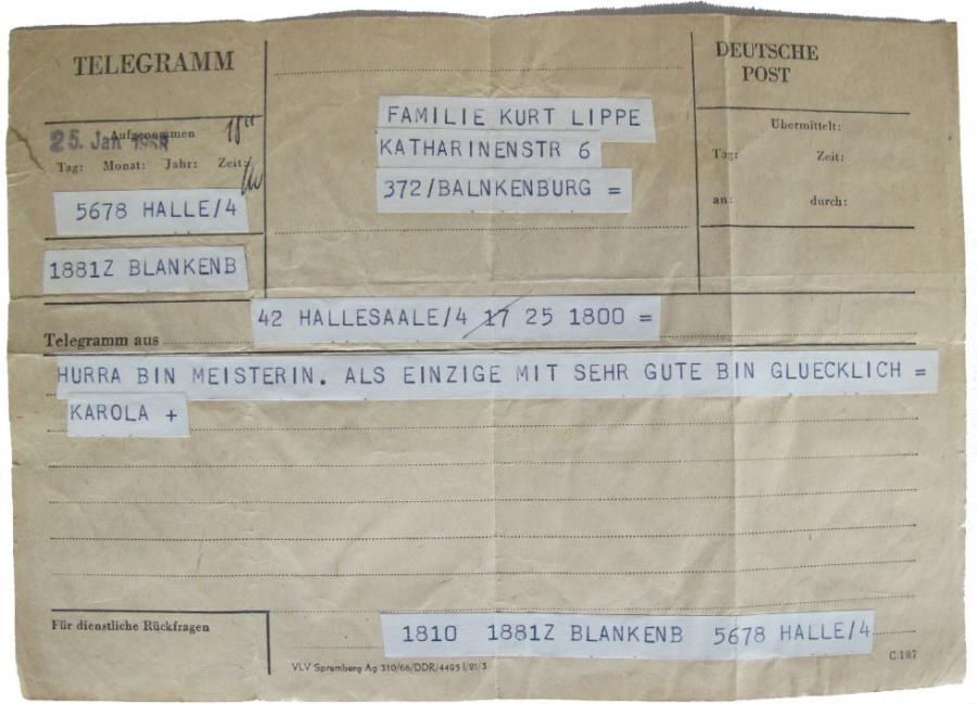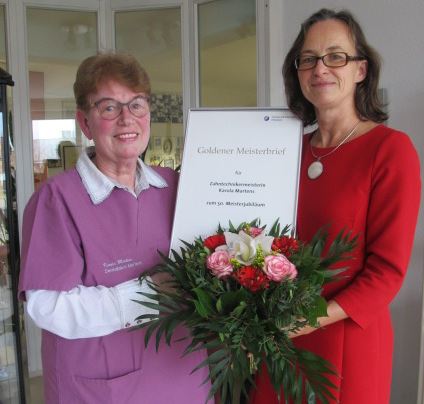 (15. März 2018) Die jüngste Meisterschülerin sei sie gewesen in der männerdominierten Meisterschulklasse am ehemaligen Traditionsstandort für die Zahntechnikerausbildung in Halle/Saale, aber in Leistung und Lernbegierde allen voraus, verrät Uwe Martens nicht ohne Stolz in seinem kleinen Rückblick über das ereignisreiche Leben seiner Ehefrau Karola Martens, die am 29.01.2018 auf 50 Jahre Meisterprüfung im Zahntechniker-Handwerk zurückblickt.