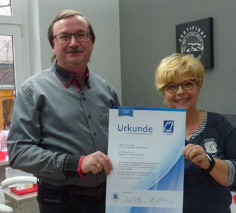 Um den hohen Anforderungen bei der Implementierung von QS-Dental und dem Umweltsiegel gerecht zu werden, haben wir uns 2014 der Unterstützung seitens des VDZI und der Handwerkskammer Magdeburg bedient. Ich möchte mich an dieser Stelle noch einmal bei Frau Christalle und Herrn Gäde für ihre fachliche und organisatorische Hilfe herzlich bedanken", so Frau ZTM Ilona Scheller bei der Entgegennahme der Urkunde.
