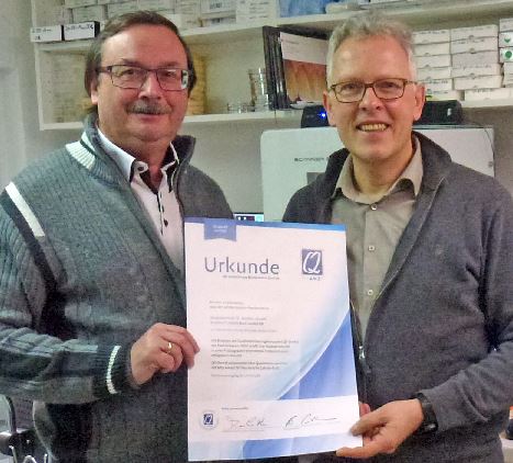 Nach erfolgreich abgelegtem Folgeaudit konnte in diesem Jahr Herr Nils Frithjof Uding, Geschäftsführer der MDZI, dem Dentallabor Scheller die entsprechende QS-Dental Urkunde erneut überreichen. Auch die Einhaltung der Kriterien des Umweltsiegels wurde vom Labor wieder erfolgreich nachgewiesen.