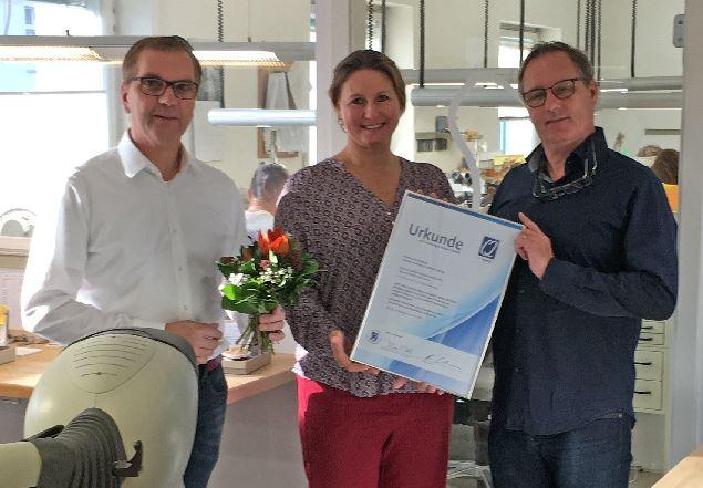 Judith Behra, Geschäftsführerin der Zahntechniker-Innung Berlin-Brandenburg übergab die entsprechende Urkunde am 20.11.17 den Betriebsinhabern Thilo Kurtz und Thomas Steffen.