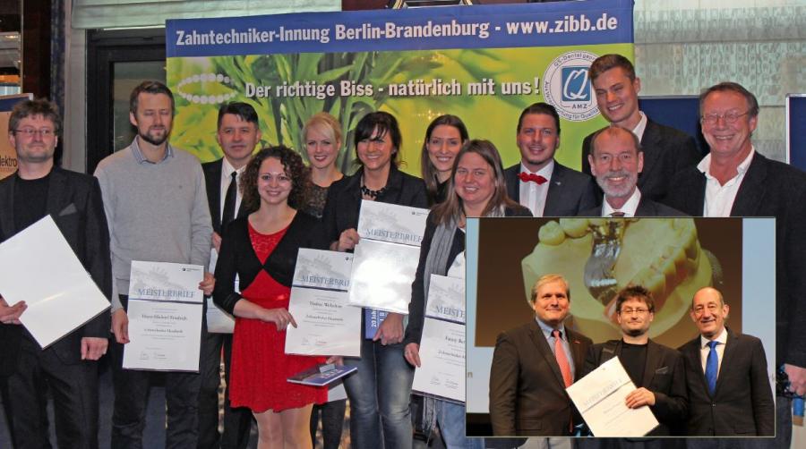 Erwin Behrend, Vorstandsmitglied der Zahntechniker-Innung Berlin-Brandenburg, sowie Burkhard Buder, Leiter der Zahntechniker-Meisterschule überbrachten den jungen Kolleginnen und Kollegen gemeinsam Glückwünsche und Urkunden. Als bester Zahntechnikermeister wurde Marco Fengler auf der Bühne ausgezeichnet.