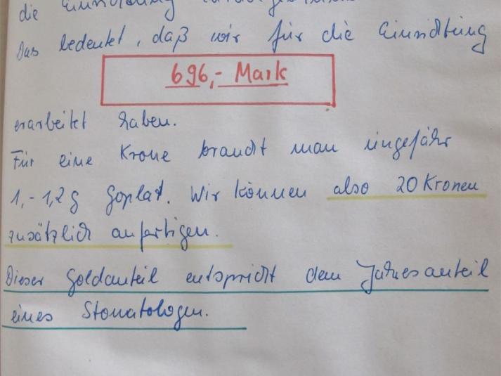Carola G.: Soweit ich mich erinnere bekam man im 1. Lehrjahr 72 Mark, in den darauffolgenden 85 Mark. Natürlich musste ich zu Hause wohnen bei dem Lohn. Wir wurden in der Herstellung von Kronen und Brücken ausgebildet. Erst nach der Wende wurden wir in Keramik weitergebildet, da es das in der DDR nicht gab.