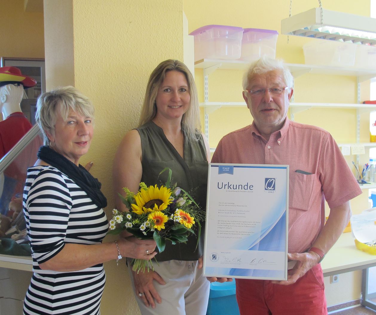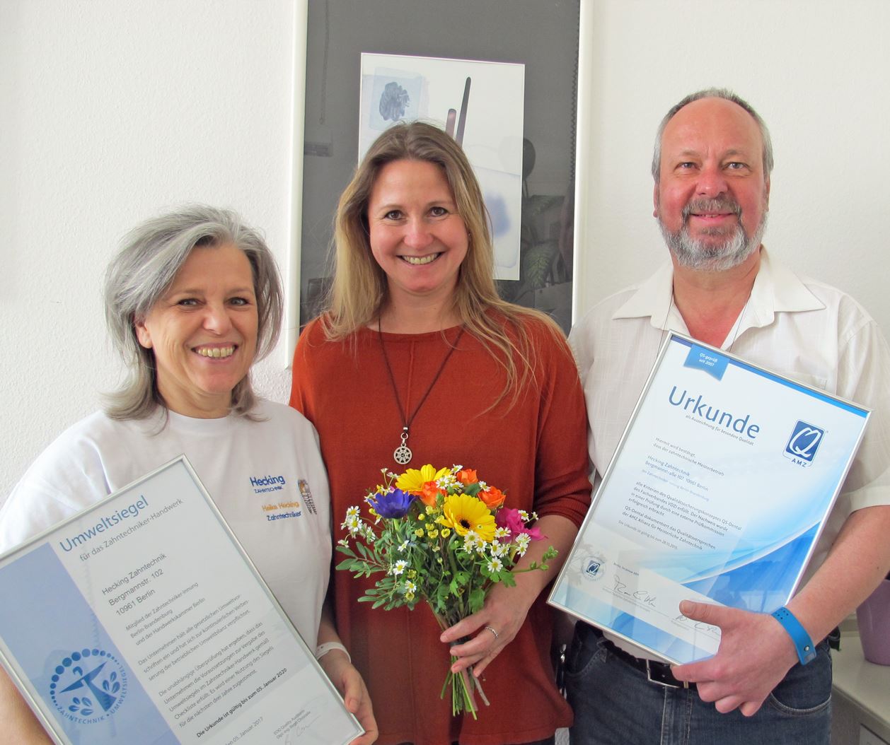 (26. Juni 2017) - In Berlin/Brandenburg waren es gleich drei Labore, denen die erfolgreich bestandene Wiederholungsprüfung zu QS-Dental oder/und dem Umweltsiegel mit der Übergabe einer Urkunde bescheinigt werden konnte: der Zahnfabrik Berlin Janenz GmbH, der Nitschke Zahntechnik GmbH und der Hecking Zahntechnik!