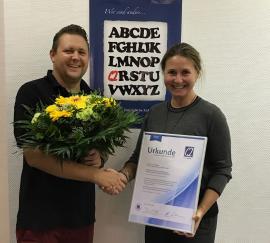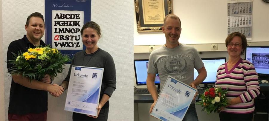 Bild links: Geschäftsführerin J. Behra überreicht R. Lüttke die Urkunde. Bild rechts : O. Gehrke und B. Szczepanski