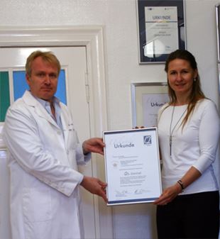 (09. Juli 2015) Es gab gleich zweimal etwas zu feiern: Die Artident Zahntechnik GmbH aus Berlin (Herr Ph.D. Hahn, linkes Bild) hat erfolgreich die Wiederholungsprüfung bestanden und ist bereits seit 2009 QS-Dental zertifiziert. Das Dentallabor Jüterbog Helga Petzhold GmbH aus Brandenburg (Herr ZTM Petzhold, rechtes Bild) hat erfolgreich die Zulassungsprüfung absolviert und zum ersten Mal die QS-Dental Zertifizierung erhalten. Wir wünschen viel Erfolg mit dem QS-Dental Siegel und freuen uns, dass ein weiteres Innungsmitglied durch die Zertifizierung den Innungsgedanken -Qualität und Sicherheit- nach außen trägt.