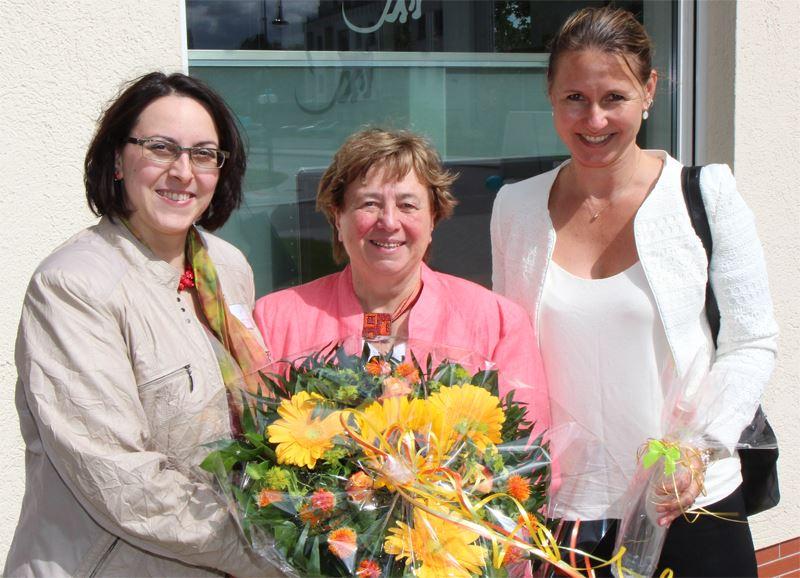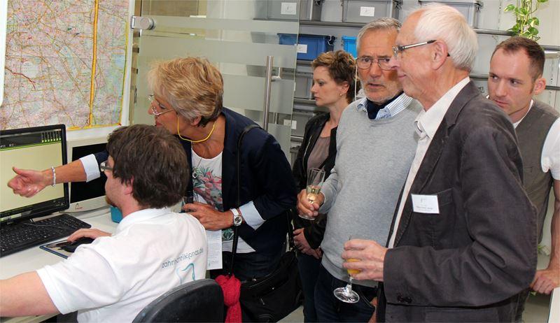 Judith Behra, Geschäftsführerin der Zahntechniker-Innung Berlin-Brandenburg gratuliert. (v.l.n.r. Karen Jonas, Inge Jonas und Judith Behra, Bild unten: Klaus-Peter Jonas beim Laborrundgang mit interessierten Besuchern
