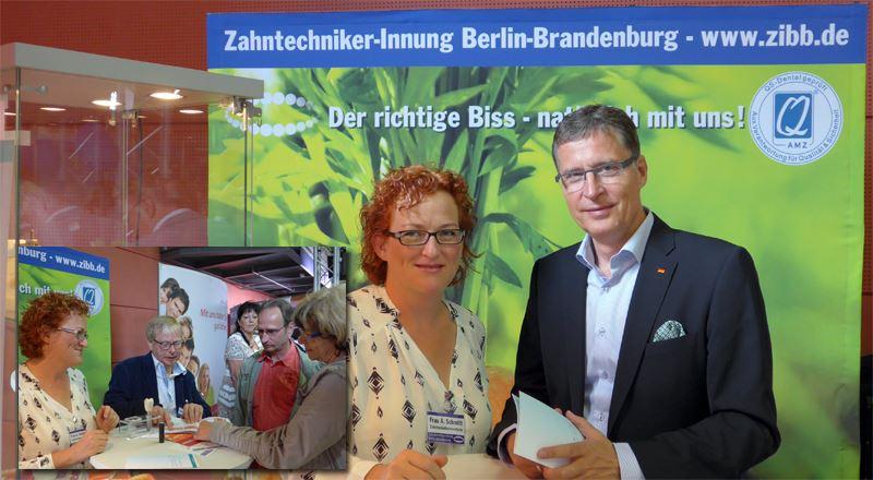 Bild: Zahntechnikermeisterin Anke Schmitt im Gespräch mit dem Bundestagsabgeordneten Jens Köppen (CDU) Bild klein: Messebesucher am Stand der Zahntechniker-Innung Berlin-Brandenburg