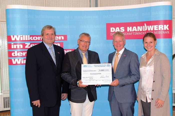 Die Übergabe der Spende erfolgte am Mittwoch, den 21.08.2013 beim Zentralverband des Deutschen Handwerks. Landesinnungsmeister Rainer Struck und Geschäftsführerin Judith Behra der Zahntechniker-Innung Berlin-Brandenburg überreichten den Scheck über 5.500 € an den Generalsekretär des ZDH, Holger Schwannecke im Beisein des Hauptgeschäftsführers der Handwerkskammer Berlin, Jürgen Wittke.