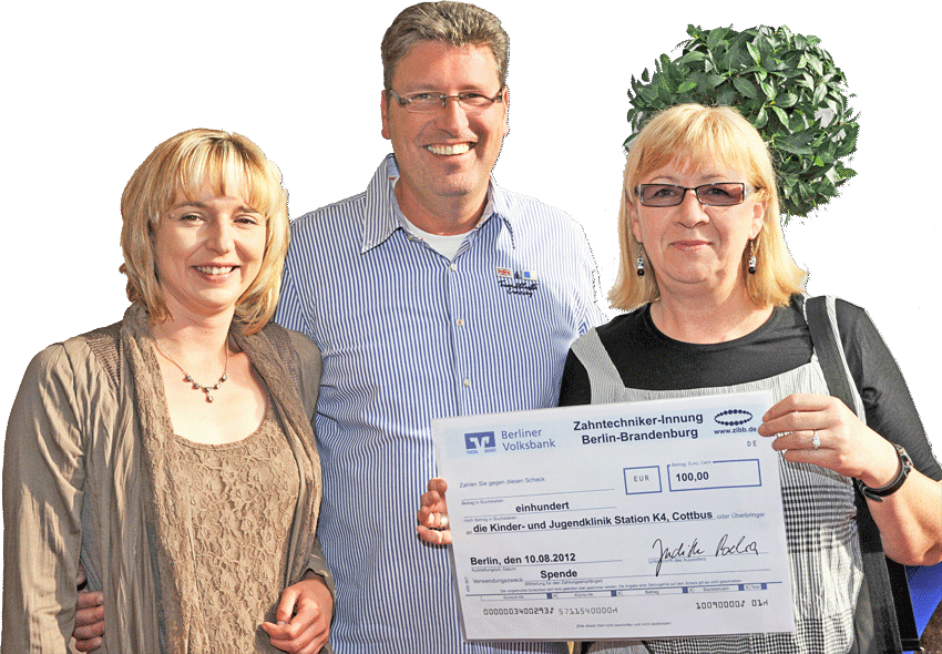 (14. September 2012) - Die MÜHE-Dentallabor GmbH feierte am 01.01.2012 ihr 20jähriges Bestehen. Anlässlich dieses Firmenjubiläums luden Zahntechnikermeister Sven Müller und seine Frau Manuela Mehwald langjährige Geschäftspartner, Freunde, Familie und Bekannte zu einem riesigen Sommerfest am 10.08.12 nach Cottbus ein. Über herzliche Glückwünsche freute man sich, statt Blumen und Geschenken nahm man kleine und große Spenden zugunsten der Kinder- und Jugendklinik des CTK-Cottbus dankbar entgegen. Auch die Zahntechniker-Innung Berlin-Brandenburg, vertreten durch das Vorstandsmitglied Frau Eva Höer, überreichte einen Scheck in Höhe von 100,00 Euro für die Station K4.